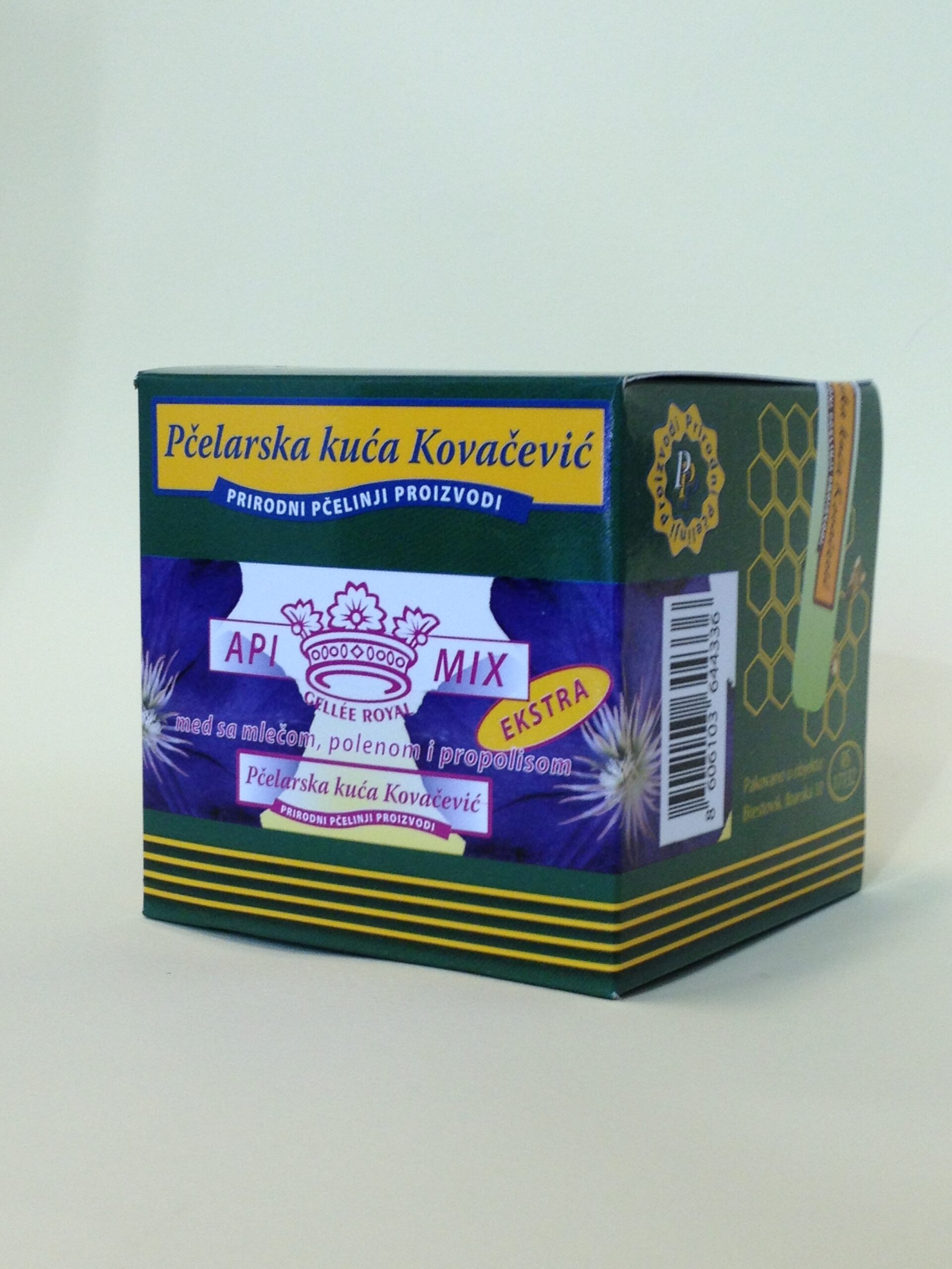 Api mix ekstra je prirodni pčelinji proizvod u čiji sastav ulazi: livadski med, matični mleč 15 g/kg,polen 200 g/kg, propolis 50 g/kg. Veoma je prijatnog ukusa.