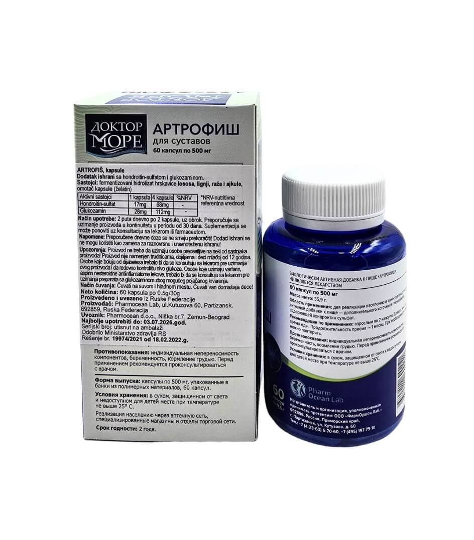 Artrofiš kapsule predstavljaju jedinstveni morski hondroprotektorski kompleks razvijen za očuvanje zdravlja zglobova, hrskavice i kičmenog stuba. Ova napredna formula kombinuje fermentativne hidrolizate hrskavice lososa, lignji, raže i ajkule sa prirodnim glukozaminom, hondroitinom, morskim kolagenom tipa II i hijaluronskom kiselinom.