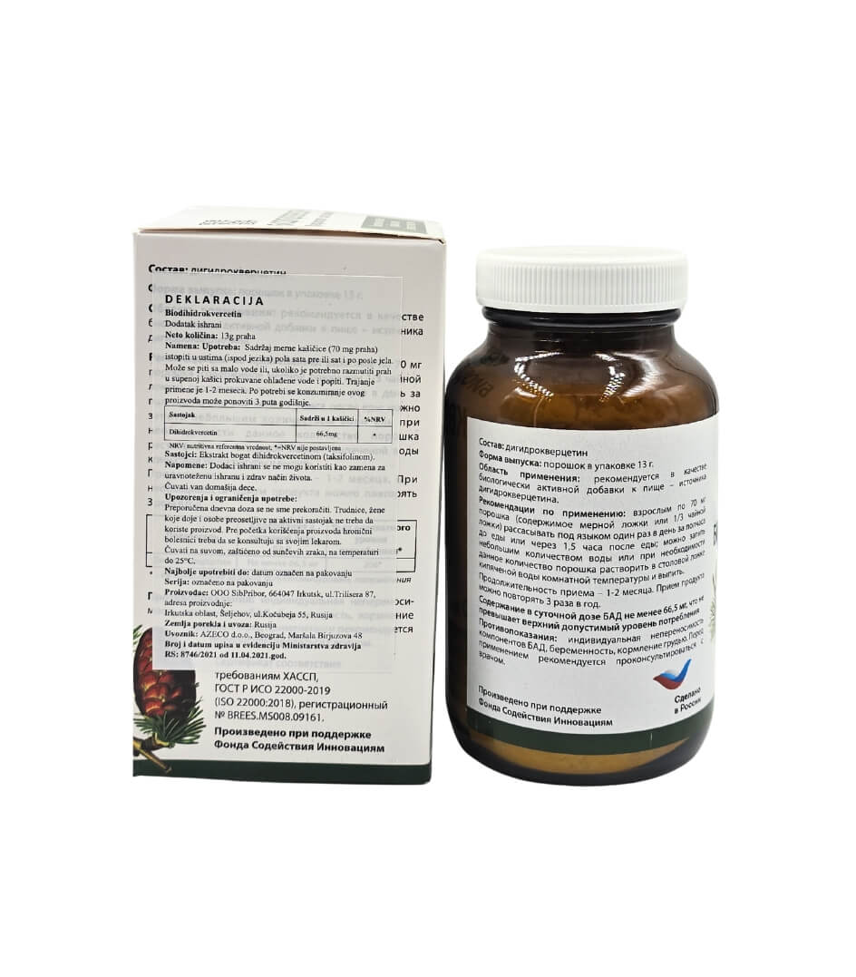 Biodihidrokvercetin prah predstavlja visoko pročišćeni oblik taksifolina (99% čistoća), dobijen iz sibirskog ariša jedinstvenim tehnološkim postupkom liofilizacije na -70°C.
