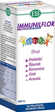 Immunilflor junior sirup sa prirodnom aromom višnje, je tečni dodatak ishrani sa acerolom, sokom borovnice, ekstraktom šipurka, cinkom I tindalizovanim probiotskim baterijama namenjen imunitetu. Šipurak I acerola predstavljaju prirodne izvore vitamina C. Koncentrovani sok borovnice sadrži jedinjenja koja su odlični antioksidansi. Cink doprinosi normalnoj funkciji imunog sistema, zaštiti ćelija od oksidativnog stresa, za zdravlje kostiju, normalnoj sintezi proteina, normalnoj kognitivnoj funkciji I održavanju normalnog vida.